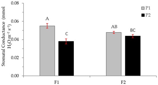 Stomatal conductance in Nothofagus alessandrii plants as a function of fertilization (F1 and F2) and plant type (P1 and P2). Different letters represent significant differences at p < 0.05.