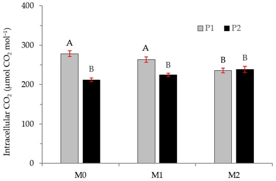 Intracellular CO2 in Nothofagus. alessandrii plants as a function of MFI treatment (M0, M1, and M2) and plant type (P1 and P2). Different letters represent significant differences at p < 0.05.
