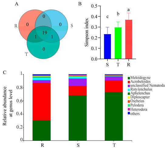 Alpha diversity of soil nematode community. (A), Number of species. (B), Simpson index. (C), Composition of soil nematode community at genus level. Different letters between the columns show the significant difference between the three tomato cultivars. S: susceptible cultivar. T: tolerant cultivar. R: resistant cultivar.