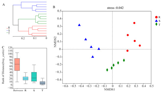 Beta diversity analysis of three soil nematode communities. (A), Hierarchical clustering analysis. (B), NMDS. (C), ANOSIM. S: susceptible cultivar. T: tolerant cultivar. R: resistant cultivar.