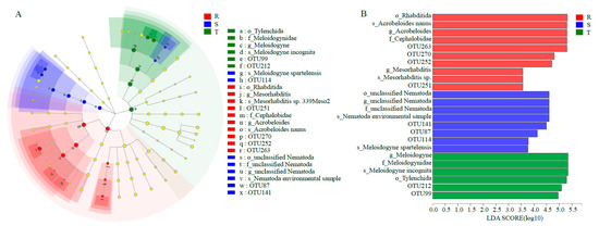LEfSe analysis of three soil nematode communities. (A), LefSe analysis. The cladogram shows the taxa with marked differences in the three soil nematode communities. Red, green and blue indicate different groups, with the classification of taxa at the level of class, order, family and genus shown from the inside to the outside. (B), Species with significant differences that had an LDA score higher than the estimated value; the default score is 3.0. The length of the histogram represents the LDA score. S: susceptible cultivar. T: tolerant cultivar. R: resistant cultivar.
