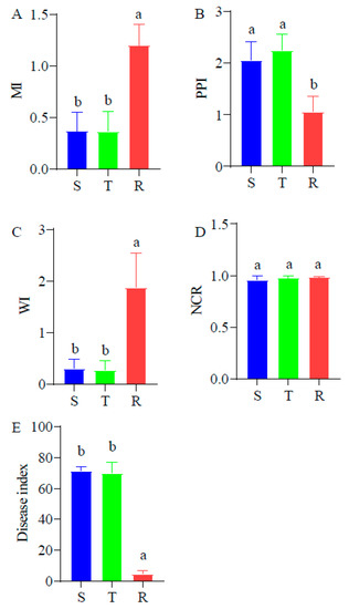 Difference in ecological indices of three soil nematode communities. (A), MI. (B), PPI. (C), WI. (D), NCR. (E), Disease index. Different letters between the columns show the significant difference among the three soil nematode communities. S: susceptible cultivar. T: tolerant cultivar; R: resistant cultivar.