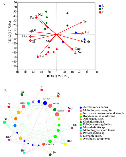 The RDA results (RDA1 75.95%) showed that Tetradecane (Te), 1,3-ditert-butylbenzene (Dbb), Heptadecane (He), N-eicosane and 1-naphthyl aminobenzene (Ne) were strongly related to the soil nematode community of R, whereas the disease index and some exudates, such as N-dodecane (Nd), Stearamide (St), Undecane (Un), 2,6-ditert-butylp-cresol (Dbc), Palmitamide (Pa) and Oleamide (Ol), correlated with the soil nematode communities of S and T (Figure 5A). Particularly, the disease index had the highest R2 value (R2 = 0.8674, p = 0.001) among the factors in the RDA results, followed by Dbc, He, Te, etc. The Mantel test also verified that the root exudates and disease index had significantly close relationships with the soil nematode communities (R = 0.569, p = 0.001). The two-factor correlation network demonstrated that the components of the root exudates had positive or negative influences on the soil nematode OTUs. For example, Tetradecane, 1,3-ditert-butylbenzene and Heptadecane were positively related to OTU263 (Acrobeloides), while 2,6-ditert-butylp-cresol, Palmitamide and Oleamide were negatively correlated with OTU263 (Figure 5B). Meloidogyne (OTU6, OTU99 and OTU212) was also affected by some components of the root exudates.