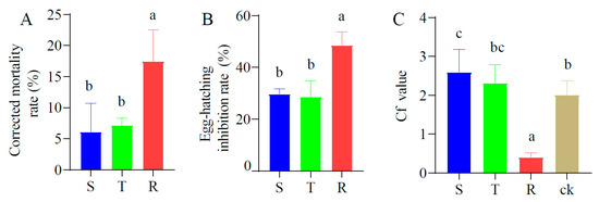 Effects of root exudates from three tomato cultivars on M. incognita. (A), Corrected mortality rate. (B), Suppression rate of egg-hatching. (C), Chemotaxis. Different letters on the column show the significant differences among three tomato cultivars. S: susceptible cultivar. T: tolerant cultivar. R: resistant cultivar.