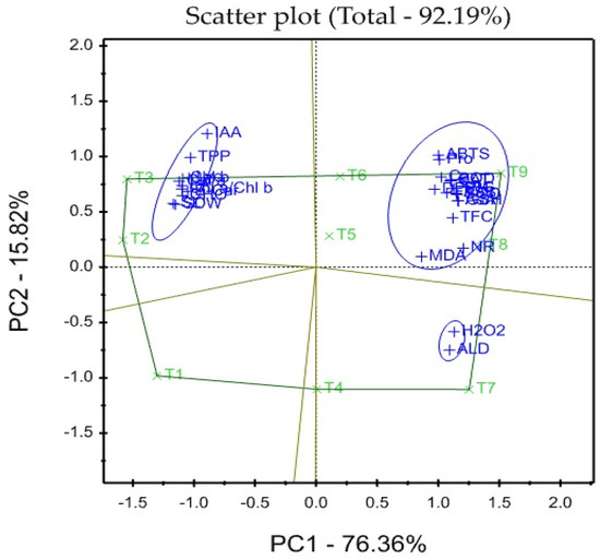 These results indicated that the two biplot graphs were characterized by a goodness of fit model where the two biplot graphs can explain sufficient amounts of the total variation of more than 92.19% of the treatment x trait pattern data. There was a positive significant association between SDW and each of Chl a, Chl b, Chl a/Chl b, TPP, IAA, CHO, β-car, Lyc, SL, and LA, while there was a significant negative association between SDW and Car, FAA, Pro, TSS, H2O2, MDA, ALD, SOD, POD, CAT, NR, AsA, GSH, TPC, TFC, DPPH, and ABTS. The polygon graph shows the association between Ca and saline in the irrigation treatment combination considering wheat traits. The variables SDW, SL, and LA behaved better under T2 and T3, while H2O2 and ALD behaved better under T4 and T7.
