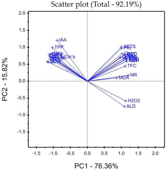 Ascorbic acid (AsA) was determined by the method of Helrich [30], while glutathione content (GSH) was measured according to Griffith [31]. Total phenolic content (TPC) was extracted and analyzed according to Diaz and Martin [32]. Total flavonoid content was determined using the aluminum chloride colorimetric method [33]. Lycopene (Lyco) and β-carotene (β-car) were measured as described previously [34]. The free radical scavenging activity (DPPH%) was measured in plant extracts [35], while the 2,2′-azino-bis (3-ethylbenzothiazoline-6-sulfonic acid) enzymatic assay (ABTS%) for measuring ABTS cation radicals was performed according to the method described by Nenadis et al. [36].