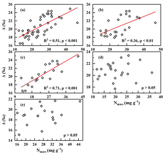 Relationship between leaf N based on mass (Nmass) and carbon-isotopic discrimination (Δ) at the community level for plants derived from the first sampling campaign: (a) Baiwangshan mountain; (b) the sunny slope of Baiwangshan mountain; (c) the shaded slope of Baiwangshan mountain; and (d) Luochuan, (e) Shapotou.