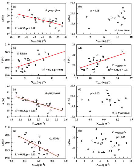 At the population level, Δ was negatively correlated with both Nmass and N based on leaf area (Narea) for Broussonetia papyrifera (B. papyrifern, R2 = 0.52, p < 0.01 for Nmass vs. Δ; R2 = 0.63, p < 0.001 for Narea vs. Δ; Figure 2a,e). Acer truncatum (A. truncatum) did not show any relationship between Δ and the two N parameters (p > 0.05 for both; Figure 2b,f). Δ was positively related to Nmass and negatively to Narea for Ginkgo biloba (G. biloba, R2 = 0.34, p < 0.01 for Nmass vs. Δ; R2 = 0.51, p < 0.001 for Narea vs. Δ; Figure 2c,g). Cotinus coggygria (C. coggygria) had a positive relationship between Nmass and Δ (R2 = 0.31, p < 0.01; Figure 2d), but lacked the relationship between Narea and Δ (p > 0.05; Figure 2h).