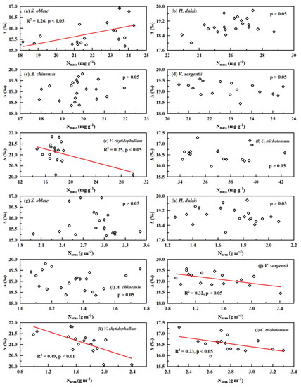 At the plant individual level, only Syringa oblate (S. oblate) showed a positive correlation between Nmass and Δ (R2 = 0.26, p < 0.05, Figure 3a), and only Viburnum rhytidophyllum (V. rhytidophyllum) showed a negative correlation between Nmass and Δ (R2 = 0.25, p < 0.05, Figure 3e), while with the other four species, Nmass was not related to Δ (p > 0.05 for all; Figure 3b–d,f). For Viburnum sargentii (V. sargentii), V. rhytidophyllum and Clerodendrum trichotomum (C. trichotomum), there were significantly negative correlations between Narea and Δ (R2 = 0.32, p < 0.05 for V. sargentii, R2 = 0.49, p < 0.01 for V. rhytidophyllum, and R2 = 0.23, p < 0.05 for C. trichotomum, Figure 3j–l), while none of the other three species had that correlation (p > 0.05 for all species, Figure 3g–i).