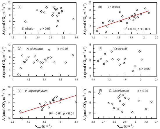 Relationships between leaf N based on area (Narea) and photosynthetic rate (A) on plant individual level for plants derived from the third sampling campaign: (a) S. oblate, (b) H. dulcis, (c) A. chinensis, (d) V. sargentii, (e) V. rhytidophyllum, (f) C. trichotomum.
