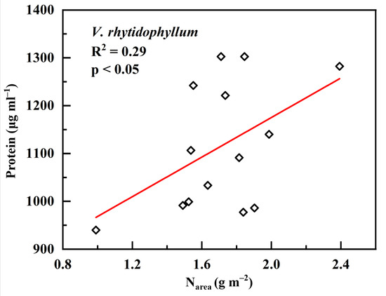 Relationship between leaf N based on area (Narea) and protein concentration in V. rhytidophyllum.