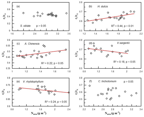 Relationships between leaf N based on area (Narea) and the ratio of intercellular to ambient CO2 concentration (ci/ca) at plant individual level for plants derived from the third sampling campaign: (a) S. oblate, (b) H. dulcis, (c) A. chinensis, (d) V. sargentii, (e) V. rhytidophyllum, (f) C. trichotomum.
