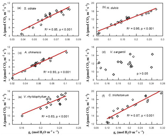 Relationships between stomatal conductance (gs) and photosynthetic rate (A) at plant individual level for plants derived from the third sampling campaign: (a) S. oblate, (b) H. dulcis, (c) A. chinensis, (d) V. sargentii, (e) V. rhytidophyllum, (f) C. trichotomum.