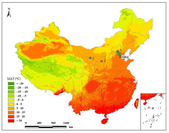 Plant sampling sites. Sampling sites are indicated with solid circles and numbers, 1, Baiwangshan Mountain, northern China; 2, Luochuan, northwestern China; 3, Shapotou, northwestern China. MAT is the mean annual temperature of the past 50 years.