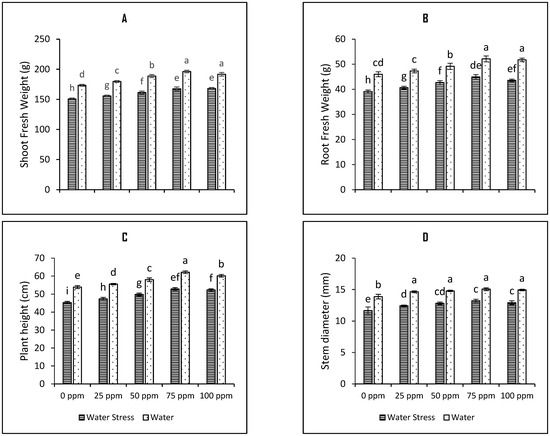 Bar charts (mean ± S.E; n = 3) representing growth attributes (A) shoot fresh weight (B) root fresh weight (C) plant height and (D) stem diameter of tomato plants raised from SeNPs-primed seeds grown under water stress and water conditions. 0, 25, 50, 75, and 100 ppm on x-axis represent concentrations of Se-NPs followed in the seed priming experiment. Bars with different alphabets represents mean data which significantly differs at (p < 0.05).
