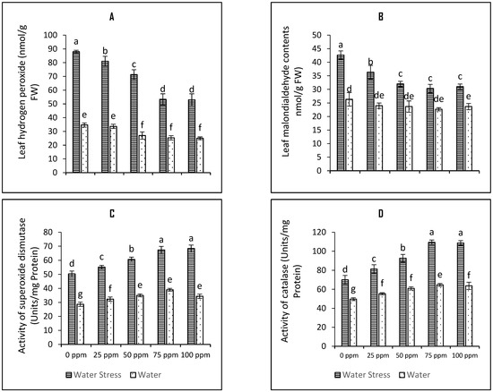 Bar charts (mean ± S.E; n = 3) representing levels of osmotic stress markers (A) leaf hydrogen peroxide contents and (B) leaf malondialdehyde contents and functioning of antioxidant enzymes (C) superoxide dismutase activity and (D) catalase activity in tomato plants raised from SeNPs-primed seeds grown under water stress and water conditions. 0, 25, 50, 75, and 100 ppm on x-axis represent concentrations of Se-NPs followed in the seed-priming experiment. Bars with different alphabets represents mean data which significantly differs at (p < 0.05).