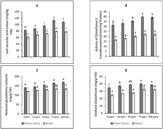 Bar charts (mean ± S.E; n = 3) representing activity of glutathione s transferase, and contents of ascorbic acid and glutathione in tomato plants raised from SeNPs-primed seeds grown under water stress and water conditions where: (A) leaf ascorbic acid contents (B) glutathione s transferase activity (C) reduced glutathione contents and (D) oxidized glutathione. 0, 25, 50, 75, and 100 ppm on x-axis represent concentrations of Se-NPs followed in the seed priming experiment. Bars with different alphabets represents mean data which significantly differs at (p < 0.05).