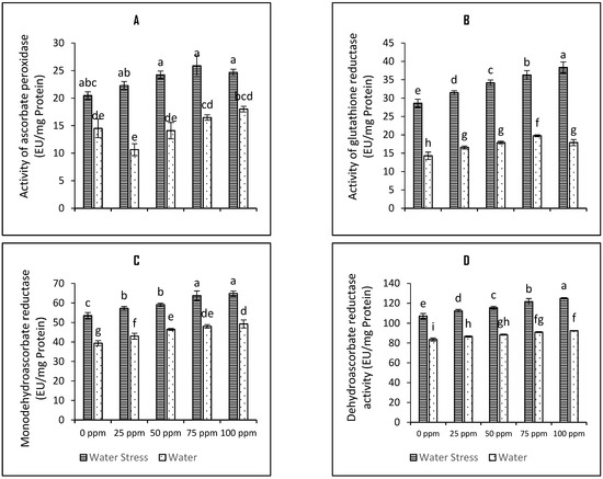 Bar charts (mean ± S.E; n = 3) representing functioning of four enzymes involved in ascorbate-glutathione cycle (A) ascorbate peroxidase (B) glutathione reductase (C) monodehydroascorbate reductase and (D) dehydroascorbate reductase for tolerance against water stress in tomato plants raised from SeNPs-primed seeds. 0, 25, 50, 75, and 100 ppm on x-axis represent concentrations of Se-NPs followed in the seed priming experiment. Bars with different alphabets represents mean data which significantly differs at (p < 0.05).