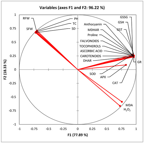 Principal component analysis (PCA) of various observed parameters followed in the study. RFW: root fresh weights; SFW: shoot fresh weights; PH: plant height; TC: total chlorophyll; SD: stem diameter; MDHAR: monodehydroascorbate reductase; DHAR: dehydroascorbate reductase; GST: glutathione s transferase; APX: ascorbate peroxidase; DR: glutathione reductase; CAT: catalase; MDA: malondialdehyde; H2O2: hydrogen peroxide; SOD: superoxide dismutase; GSH: reduced glutathione; GSSG: oxidized glutathione.