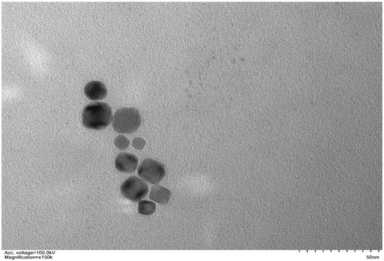Dark orange to dark red SeNPs were supplied by Sigma Aldrich (Product No. 919519). According to the manufacturer, inductively coupled plasma–mass spectrometry (ICP–MS) was carried out to comprehend the elemental composition, which confirmed the presence of Se. According to the suppliers, the size distribution of SeNPs ranges between 70 and 90 nm. In order to better understand the geometry of SeNPs, the Department of Botany, University of Gujrat, Pakistan conducted a transmission electron microscopic (TEM) examination. The results revealed that the SeNPs particles were spherical to quasi-spherical in shape (Figure 7). Various SeNPs concentrations, including trials at 25, 50, 75, and 100 ppm, as well as 0 ppm as the control treatment, were created for the seed priming treatment following [22]. To guarantee homogeneous dispersion, SeNPs were exposed to ultrasonication for 30 min. In the control treatment, the seeds were submerged in distilled water. All priming procedures were carried out for roughly 24 h in total at 25 °C.