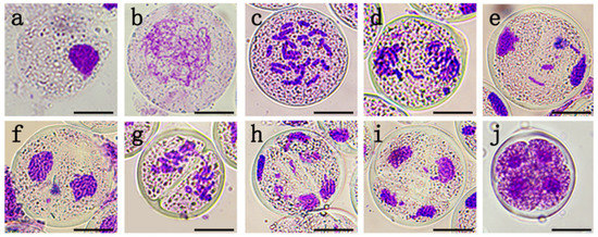 Meiotic processes of PMCs of ‘Black Beauty’. (a) Interphase. (b) Prophase I. (c) Metaphase I. (d) Anaphase I. (e) Telophase I. (f) Prophase II. (g) Metaphase II. (h) Anaphase II. (i) Telophase II. (j) Tetrad.