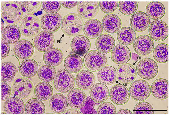 A mixture of meiotic stages in one flower bud. Arrows show M I (metaphase I), P II (Prophase II), and T II (Telophase II). (Bar = 100 μm).
