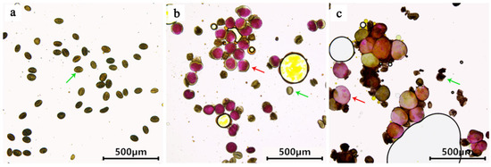 Comparison of sterile and fertile pollen from ‘Black Beauty’. (a) Control group. (b) Pollen grains obtained after 4 h treatment at 42 °C. (c) Pollen grains obtained after 6 h treatment at 42 °C. (Nonfertile pollen indicated by green arrows, and fertile pollen indicated by red arrows).