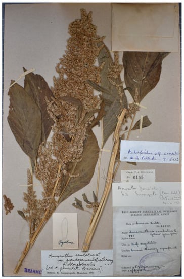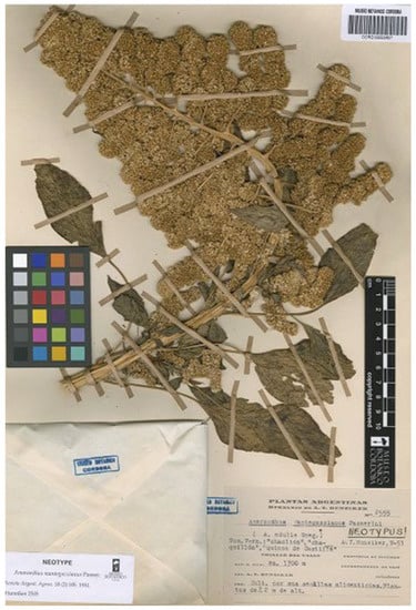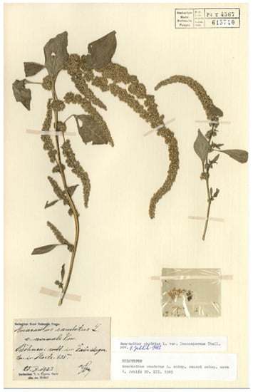 - Iamonico, D. Lectotypification of Linnaean names in the genus Amaranthus L. (Amaranthaceae). Taxon 2014, 63, 146–150. [Google Scholar] [CrossRef]