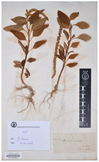 Carl Ludwig Sprenger was a German botanist (30 November 1846–13 December 1917) who lived in Naples from 1877 to 1907 where he was partner in the horticultural house of Damman & Co. of San Giovanni Testuccio (a district of the eastern area of Naples city). Sprenger collected many seeds and prepared hundred specimens which, however, were destroyed after the eruption of Vesuvius on 4 April 1906 [] (p. 268). Original material for Amaranthus dussi is not, therefore, in extant and, according to Art. 9.8 of ICN, a neotypification is required. On the basis of the original description [] (p. 178), A. dussi displays synflorescence with “fiori riuniti in lunghe e grosse spighe conglomerate prime erette e poi elegantemente riflesse e pendule” (=“flowers arranged in long and big spikes ammassed before erect, then stylishly reflexed and pendulous”). This trait is typical of just one Amaranthus species, i.e., A. caudatus [,,]. I here propose a specimen preserved at NAP (barcode NAP0000610), collected in Naples Province, as the neotype of the name Amaranthus dussi (Figure 6). Based on Sprenger‘s description [] (p. 178), and the treatment here proposed, A. dussi is to be considered as a synonym of A. caudatus.