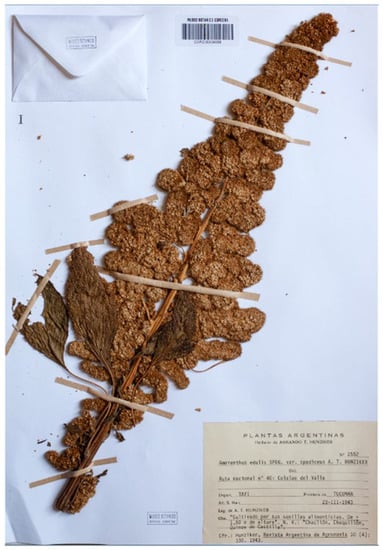 Spegazzini [] (p. 163) provided a detailed diagnosis and description, as well as the provenance (“Hab. Cultivado en la región árida y montañosa de la provincia de Salta por la población indigena”). Bayón [] (p. 276) indicated the holotype for this name (“TIPO: cultivado en La Plata, s.f., C. L. Spegazzini s.n. (holotipo, LPS-12665 en LP-16325!)”). However, first, no holotype was cited in the protologue and a lectotypification is necessary according to the Arts. 9.1, 9.3, and 9.4 of ICN (see also the considerations by McNeill []). So, Bayón’s holotype’s indication has to be considered as a lectotype. However, according to Art. 7.11 of ICN, “designation of a type is achieved only if… on or after 1 January 2001, if the typification statement includes the phrase “designated here” (hic designatus) or an equivalent”. Since this phrase was not reported by Bayón [] (p. 276), his typification is not valid. I here designate the specimen LP12665 (cited by Bayón [] (p. 276)) as the lectotype of the name Amaranthus edulis (Figure 7).