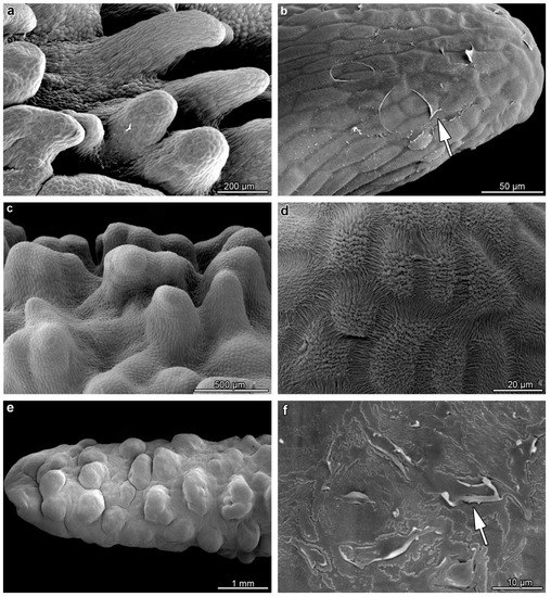 Micromorphological features of the adaxial surface of the labellum of B. carunculatum. (a,b) Elongated, multicellular outgrowths covered with ruptured cuticle ((b), white arrow) in the basal part of the lip. (c,d) Middle part of the lip with shorter, wide outgrowths with a strongly striated cuticle (d). (e,f) Apical part of the lip with secretory residues (white arrow) noted on the wart-like outgrowths.