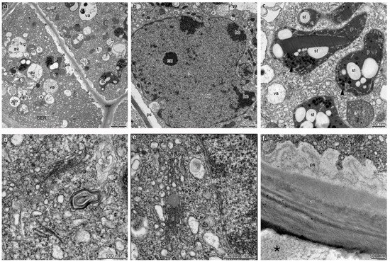 The TEM studies of the labellum showed metabolically active cells of the epidermis and sub-epidermis, containing dense cytoplasm (Figure 4a–f), enlarged nuclei (Figure 4b), numerous mitochondria (occasionally in the degenerative stage) (Figure 4a–c and Figure 5a–c), profiles of rough (RER) and smooth (SER) endoplasmic reticulum (Figure 4c,e), singular, fully developed dictyosomes (Figure 4d,e), and lipid droplets. Euchromatin was dominant in the cell nucleus, and small amounts of heterochromatin were concentrated near the nuclear envelope (Figure 4b). Additionally, an abundance of plastids with a large electron-dense body, plastoglobuli, tubules, and starch grains were present (Figure 4a,c and Figure 5b). The noteworthy feature was the presence of small vacuoles with osmiophilic material (possibly tannins) (Figure 4a–c and Figure 5b), besides autophagic vacuoles (Figure 4a), and numerous vesicles, often fusing with plasmalemma (Figure 4a and Figure 5a,c), as well as myelin-like figures occurring both in the cytoplasm of the adaxial epidermis (Figure 4d) and sub-epidermis of the labellum.
