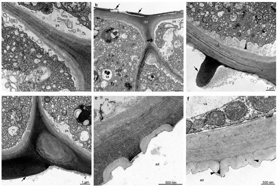 Ultrastructure of the adaxial epidermis of the middle (a–e) and lateral (f) lobes of the labellum of B. carunculatum (TEM). (a–c) Cells with periplasmic space, flocculated secretory material, and numerous vesicles building into plasmalemma ((c), black arrowhead). (b–e) Adaxial epidermis with ruptured cuticle and residues of secretion on the surface (b–d) (black arrowheads). (f) Cell wall with a cuticle with microchannels with secretion (black arrowheads). c: Cuticle, cw: cell wall, m: mitochondrion, p: plastid, ps: periplasmic space, va: vacuole, v: vesicle.