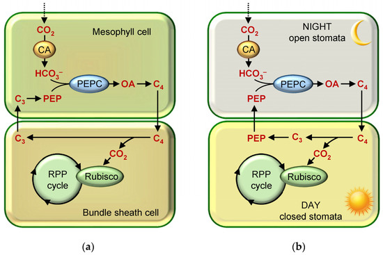 Schematic representation of dark phase photosynthesis reactions in (a) C4 plant cells; (b) CAM plants. Abbreviations: C3/C4—C3/C4-dicarboxylic acids; OA—oxaloacetate; PEP—phosphoenolpyruvate; PEPC—phosphoenolpyruvate carboxylase.