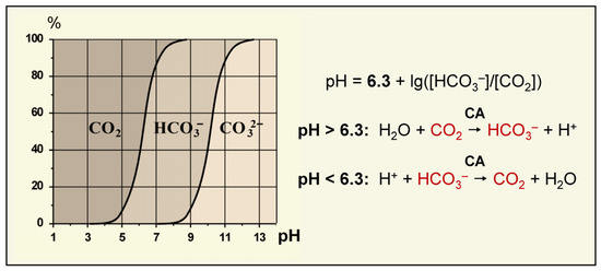 The concentration ratio and pH dependence of Ci forms in water solutions [65]; the Henderson–Hasselbach equation for [CO2]/[HCO3−] ratio; and the preferential direction of the reaction ensured by CA as a function of pH.