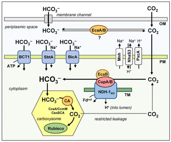 CCM in model strains of cyanobacteria. The periplasmic CAs, EcaA and EcaB are also shown, but their involvement in the CCM has not yet been confirmed. Abbreviations: OM—outer membrane; PM—plasma membrane; TM—thylakoid membrane.