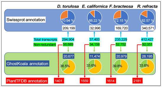 - Grabherr, M.G.; Haas, B.J.; Yassour, M.; Levin, J.Z.; Thompson, D.A.; Amit, I.; Adiconis, X.; Fan, L.; Raychowdhury, R.; Zeng, Q.; et al. Trinity: Reconstructing a full-length transcriptome without a genome from RNA-Seq data. Nat. Biotechnol. 2011, 29, 644. [Google Scholar] [CrossRef]