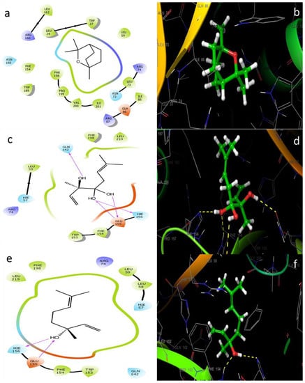 Linalool bound to the active site through two conventional hydrogen bonds with a binding energy value of −3958 kcal/mol, higher than the control. The liaisons were HIE156 and GLU155, and the following residues LEU58, LEU59, PHE154 and TRP153, have been mainly implicated in the hydrophobic interaction.