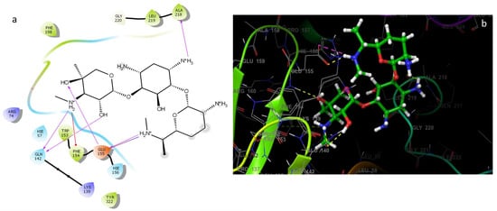 Intermolecular interactions 2D (a) and 3D (b) between gentamicin (control) with E. coli 1VLY protein.