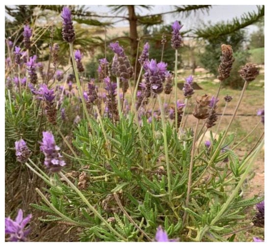 The aerial parts of the plant (leaves, stems, and flowers) of wild populations of L. officinalis (Figure 4) were manually collected in June 2018, in the Jerada Region (East of Morocco). The area of plant collection was characterized by short, hot and dry summers, and long, dry and cold winters with low precipitations, which is a typical Mediterranean climate.