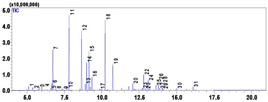 The obtained EO was analyzed using the gas chromatography with mass spectroscopy (Shimadzu GC-MS-QP2010, Japan), according to the protocol described previously by []. Helium inert gas was used as a carrier, and its pressure was adjusted to 100 KPa. Further modifications were realized, such as the oven temperature which was maintained at 50 °C for about 1 min, was subjected to a gradient of about 10 °C/min to reach an oven temperature of 150 °C. Afterwards, a gradient of 20 °C/min was set to reach a temperature of 250 °C. For the analysis of the samples, a quantity (1 µL) was taken from the EO and diluted in hexane. The injector was set at 240 °C on split mode with a ratio of (25:1). For the identification of the different constituents, a comparison of the retention time of each compound with its MS data using the National Institute of Standards and Technology (NIST) computer library was used [,,] (Figure 5), following the same procedure as [].