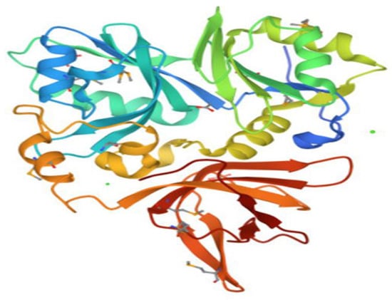 The crystal structure of the E. coli with the crystalline structure (PDB ID: 1VLY) in Figure 6 had a resolution of 1.30 Å. The Rfree value was 0.168 while the Rwork value was around 0.134, which agreed well with the observed R-Value of 0.136. The proteins were selected and obtained from the PDB (Protein Data Bank) []. The protein structure was prepared using the Protein Preparation Wizard (Maestro 12.8, Schrodinger 2021-2, BioLuminate 2019). The ligand and water atoms were removed, as non-polar hydrogens were fused. While preparing the protein binding orders, personalized hydrogen atoms were also added and hot states using Epik: pH (7 ± 2) were generated. The minimization of the energy has been performed using the default RMSD limitation at 0.3 Å. The active site was chosen as the target center. The dimensions of the central grid box were chosen to include all atoms of the ligand set using the points (for x = 10, y = 10 and z = 10). Energy minimization was conducted by default, limiting the RMSD to 0.3 Å, and then the structure of the protein was minimized using the OPLS_2005 force field. Finally, the extra precision (XP) glide score was used to predict binding energy and to select anchored poses. Output docking scores were expressed as affinity binding (kcal/mol).