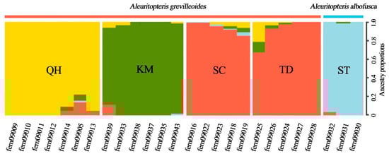 Analysis of Population Structure. Note: Aleuritopteris grevilleoides include QH (yellow), KM (green), SC (red), and TD (red); A. albofusca is ST (blue).