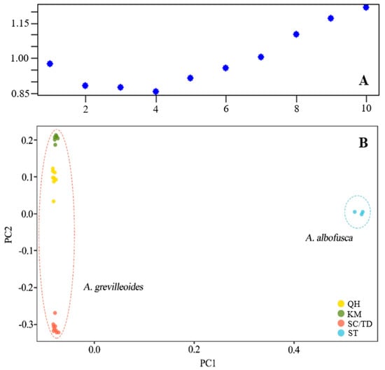 Based on the clustering of 8085 SNP loci after filtering, the CV value of genetic structure analysis was the smallest when K was 4 (Figure 1 and Figure 2A). When the best grouping value (K) of 4 was selected, 26 studied individuals were grouped into four clusters, and A. grevilleoides samples were divided into three genotypes (Figure 1). A small amount of introgression was observed between the three genetic groups of A. grevilleoides (QH, KM, and SC; Figure 1). The KM population was far away from other populations and had less gene exchange (Figure 1), and the QH group was similar to the KM group. Principal component analysis (PCA) also revealed four genetic groups of studied individuals (Figure 2B): the A. albofusca and A. grevilleoides were clearly separated and three genetic groups in A. grevilleoides, which was consistent with the results of the structural analysis.