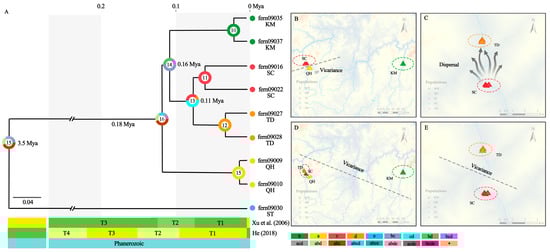 Divergence-time estimation and S-DIVA reconstruct historical biogeography: (A) Divergence-time estimation and S-DIVA reconstruct historical biogeography; (B) The node 14: The A. grevilleoides was probably widely distributed in the ABC area, and then a vicariance event occurred at A area; (C) The node 14: The original distribution area was C spread to D; (D) B vicariance occurred; (E) The node 12: a geographical separation (vicariance) between C and D has occurred. Note: The numbers inside the circle represent nodes; The terraces of dry-hot valley time node are references [,]; T1: The first terrace of the dry-hot valley; T2: The second terraces of the dry-hot valley; T3: The third terraces of the dry-hot valley.