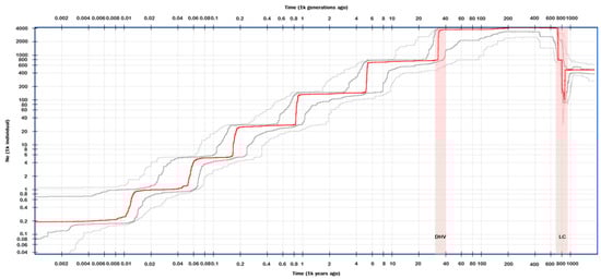 Historical fluctuation of effective population size of A. grevilleoides. Note: Red line: median of 200 inferences based on subsampling. Dark gray lines: 75% confidence interval of the inference. Light gray lines: 95% confidence interval of the inference. DHV: The first terraces in the dry-hot Valley; LC: the historical drainage capture events between the Luquan Wudongde and Canyon-Jinpingzi.