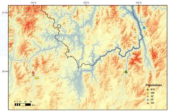 Aleuritopteris grevilleoides is mainly distributed in the west of Yunnan Province (Binchuan and Dayao) and the north of Sichuan Province (Qingchuan) in China, according to documentation records []. During the field investigation, no wild populations of A. grevilleoides were found in Sichuan, and only four populations (Figure 5) were found in Dayao County (SC, TD, and QH) and Kunming (KM), Yunnan. Twenty-three individuals from four wild populations (A. grevilleoides) and three individuals from the wild population of its closely related species (Aleuritopteris albofusca (Baker) Pic.Serm.) were collected. The collection scope covered the distribution areas found in the field of A. grevilleoides. The samples were grouped according to regional distribution (Figure 5). The sample materials for sequencing are all from fresh pinnae, and the whole plant was selected for pressing voucher specimens, dried in an oven, and stored in the herbarium of Shanghai Chenshan Botanical Garden (CSH). The detailed sample information is shown in Table 3.
