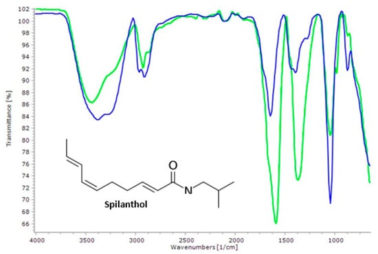- Boonen, J.; Baert, B.; Burvenich, C.; Blondeel, P.; De Saeger, S.; De Spiegeleer, B. LC–MS profiling of N-alkylamides in Spilanthes acmella extract and the transmucosal behaviour of its main bio-active spilanthol. J. Pharm. Biomed. Anal. 2010, 53, 243–249. [Google Scholar] [CrossRef]