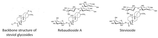 - Ceunen, S.; Geuns, J.M.C. Steviol Glycosides: Chemical Diversity, Metabolism, and Function. J. Nat. Prod. 2013, 76, 1201–1228. [Google Scholar] [CrossRef]