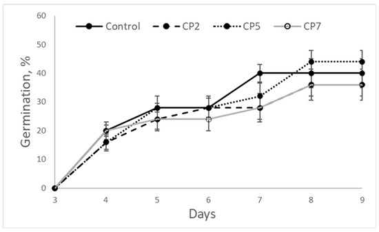 The untreated (control) seeds and CP-treated seeds were evenly distributed on the humidified substrate surface (4 growth containers (9 × 9 × 10 cm) of 25 seeds each) and watered with 50 mL distilled water. Growth containers were filled with substrate BioSoil (SIA “Green-PIK LAT”, reg. No. K0.02-1386-16, Lauces, Latvia), consisting of high-quality vermicompost, moss peat and sand. Characteristics: nitrogen (N)—0.3%, phosphorus (P2O5)—0.2%, potassium (K2O)—0.3%, organic substances—min 14.6%, humidity—max 30%, pH 6–7. Growth containers with seeds were placed in a climatic chamber (KK 750, Pol-Eko sp. k., Wodzisław Śląski, Poland) with automatic control of relative humidity (60%), light and temperature. Alternating light regime was maintained in the chamber (16 h light, 8 h dark) and constant temperature of 25 ± 1 °C. Seeds were provided additional water, if necessary, to prevent drying. A seed was considered germinated when the initial emergence of the radicle was observed. Germinated seeds were counted daily until their number stopped increasing.